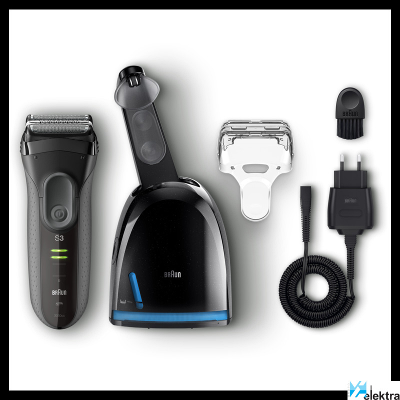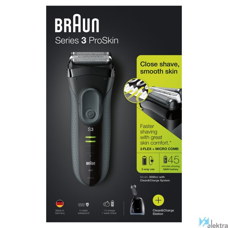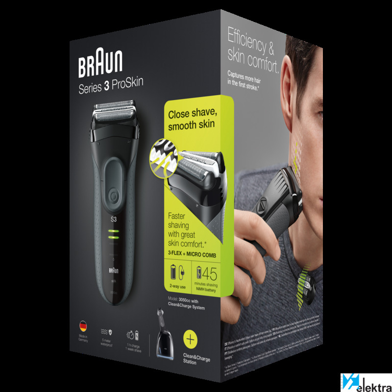 Braun Series 3 3050cc. Sistema de afeitado: Máquina de afeitar de láminas, Color del producto: Negro, Gris, Tecnologías de sistema de afeitado: 2 x SensoFoil. Fuente de energía: AC/Batería, Tecnología de batería: Níquel-metal hidruro (NiMH), Tiempo de funcionamiento: 45 min. Peso: 916 g, Peso de la batería: 22 g. Ancho del paquete: 157 mm, Profundidad del paquete: 157 mm, Altura del paquete: 252 mm. Cantidad por paquete: 1 pieza(s), Funciones de la base de la máquina de afeitar: Carga, Limpieza