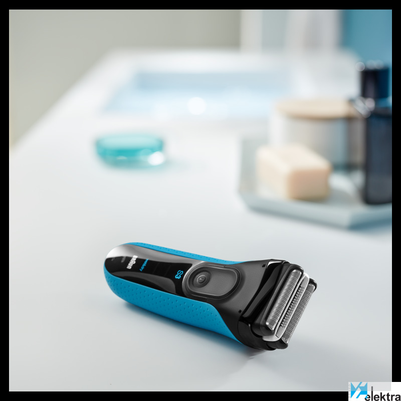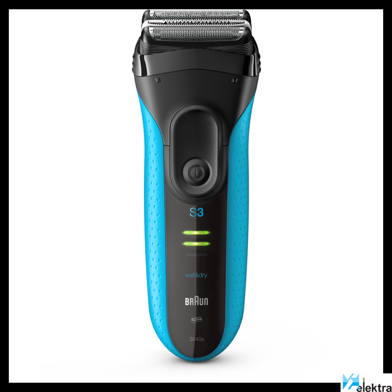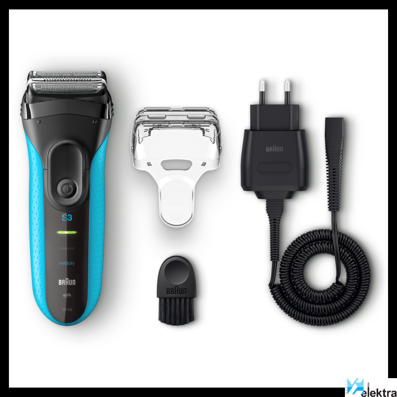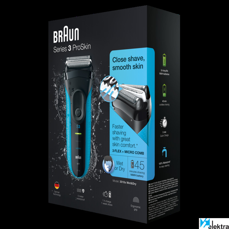 Braun Series 3 3010 Wet & Dry. Sistema de afeitado: Máquina de afeitar de láminas, Color del producto: Negro, Azul, Tecnologías de sistema de afeitado: 2 SensoFoil, 1 Middle Trimmer. Fuente de energía: Batería, Tecnología de batería: Níquel-metal hidruro (NiMH), Autonomía: 45 h. Peso: 372 g, Peso de la batería: 22 g. Ancho del paquete: 67,5 mm, Profundidad del paquete: 155 mm, Altura del paquete: 222 mm. Cantidad por paquete: 1 pieza(s)