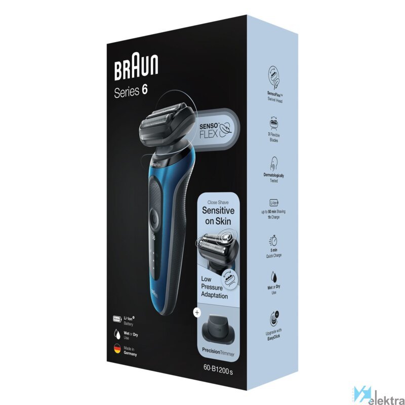 Braun Series 6 . Sistema de afeitado: Máquina de afeitar de láminas, Color del producto: Azul, Tipo de control: Control deslizante. Fuente de energía: Batería, Tecnología de batería: Ión de litio, Tipo de batería: Batería integrada. Tipo de embalaje: Caja. Funciones de la base de la máquina de afeitar: Carga, Limpieza, LubricanteRecipiente :