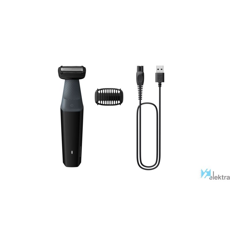 Philips BODYGROOM Series 3000 BG3017/01 Recortador corporal e íntimo impermeable. Color del producto: Negro, Gris, Accesorios de cuidado corporal: Máquina de afeitar de láminas, Sistema de afeitado: Máquina de afeitar de láminas. Fuente de energía: Batería, Tecnología de batería: Níquel-metal hidruro (NiMH), Tiempo de funcionamiento: 50 min