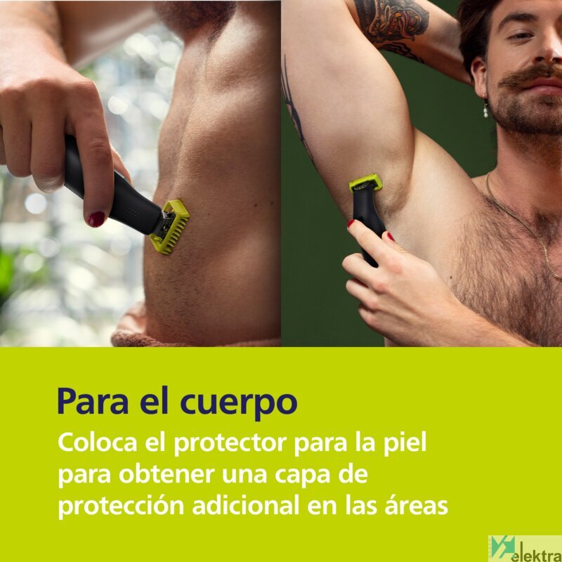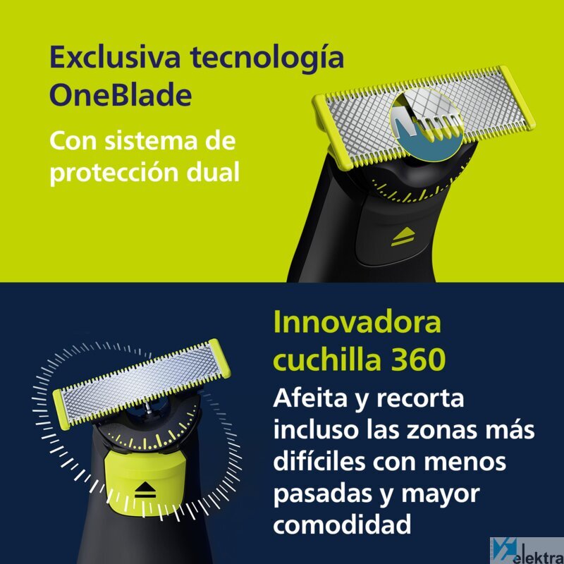 | Información suplementaria | Philips OneBlade Pro Face + Body recorta, perfila y afeita cualquier longitud de pelo. Incluye una cuchilla para la cara y otra para el cuerpo con un protector para la piel. Ya no tendrás que utilizar varios productos, OneBlade se encarga de todo. Utiliza el peine-guía de precisión regulable incluido para recortar la barba y obtener un acabado uniforme. Elige una de las 20 posiciones de longitud con bloqueo para conseguir una barba corta, una barba media o un estilo de barba larga. |