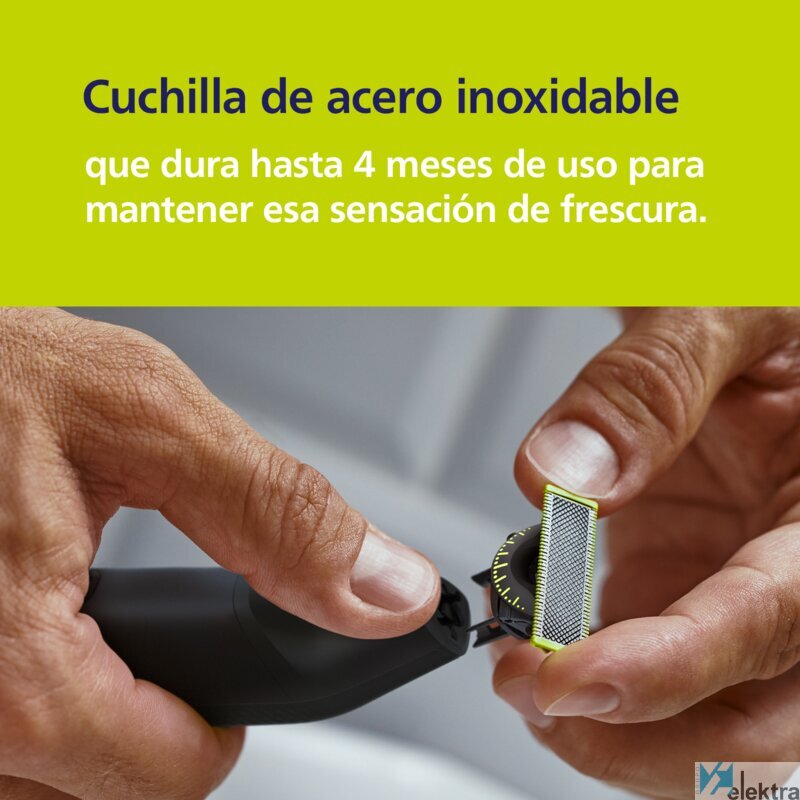 | Tipo de Cuchillas | OneBlade sigue los contornos de la cara para que puedas afeitar todas las zonas faciales con total comodidad y facilidad. Utiliza la cuchilla de doble cara perfila los bordes y crea líneas definidas moviendo la cuchilla en cualquier dirección. Acero inoxidable. |