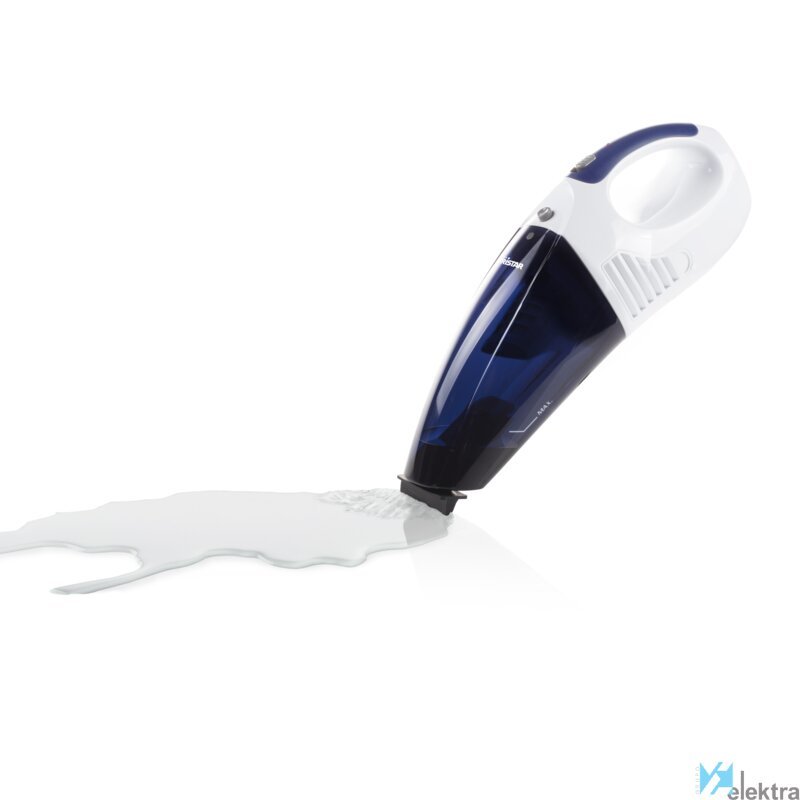 Tristar KR-2176 Aspirador de mano. Tipo de limpiador: Seca y húmeda, Nivel de ruido: 68 dB. Tipo de depósito: Sin bolsa, Color del producto: Azul, Blanco, Capacidad del depósito del polvo en seco: 0,55 L. Fuente de energía: Batería, Tiempo de funcionamiento: 15 min, Tecnología de batería: Níquel-metal hidruro (NiMH). Peso: 1,2 kg, Ancho: 115 mm, Profundidad: 145 mm. Ancho del paquete: 410 mm, Profundidad del paquete: 310 mm, Altura del paquete: 480 mm