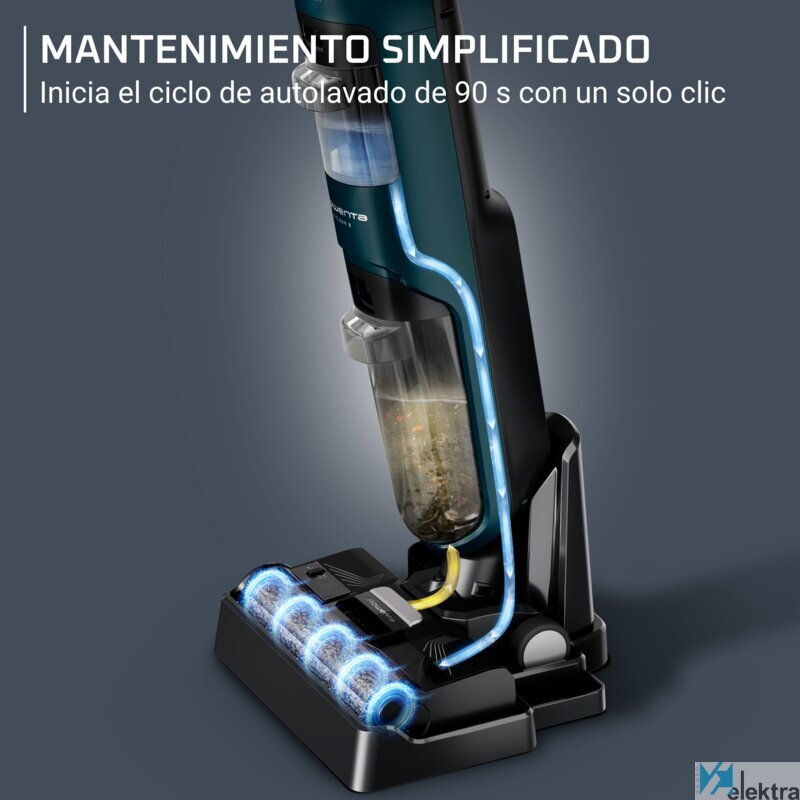 Rowenta X-Clean 2 GZ2251E0. Tipo de producto: Aspiradora escoba, Tipo de depósito: Sin bolsa, Color del producto: Negro, Azul oscuro. Tipo de limpiador: Seca y húmeda, Filtración de aire en aspiradora: Ciclónico, Método de separación de la suciedad: Filtrado por agua. Control de potencia: Electrónico. Fuente de energía: Batería, Potencia máx. de entrada: 120 W, Voltaje de la pila: 18 V. Ancho ...Recipiente :