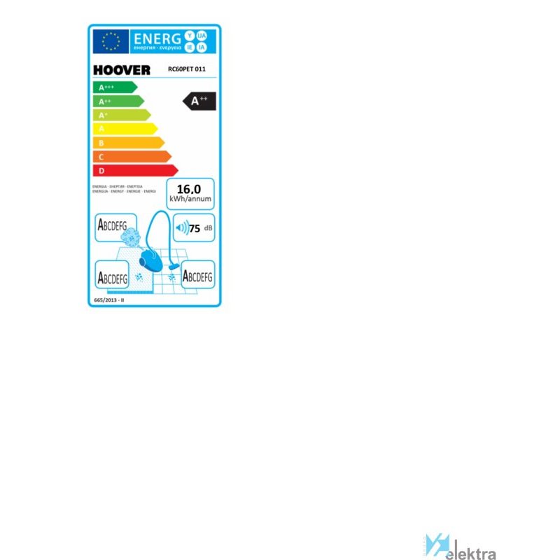 Hoover Reactiv RC60PET 011. Potencia máx. de entrada: 450 W. Tipo: Aspiradora cilíndrica, Tipo de limpiador: Secar, Tipo de depósito: Sin bolsa, Capacidad para polvo: 2 L. Filtración de aire en aspiradora: EPA, Método de separación de la suciedad: Ciclónico, Nivel de ruido: 75 dB. Color del producto: Azul