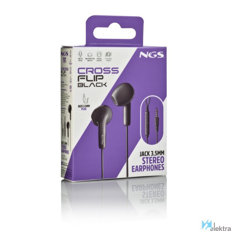 NGS CROSS FLIP. Tipo de producto: Auriculares. Tecnología de conectividad: Alámbrico. Uso recomendado: Llamadas/Música. Frecuencia de auricular: 20 - 20000 Hz. Longitud de cable: 1,2 m. Peso: 11 g. Color del producto: NegroRecipiente :