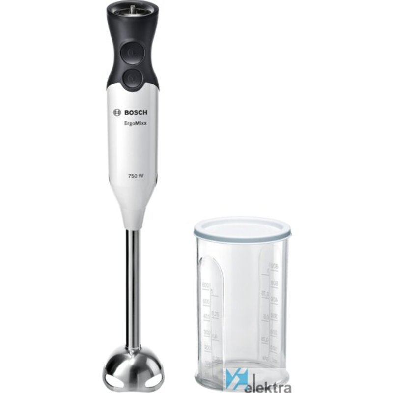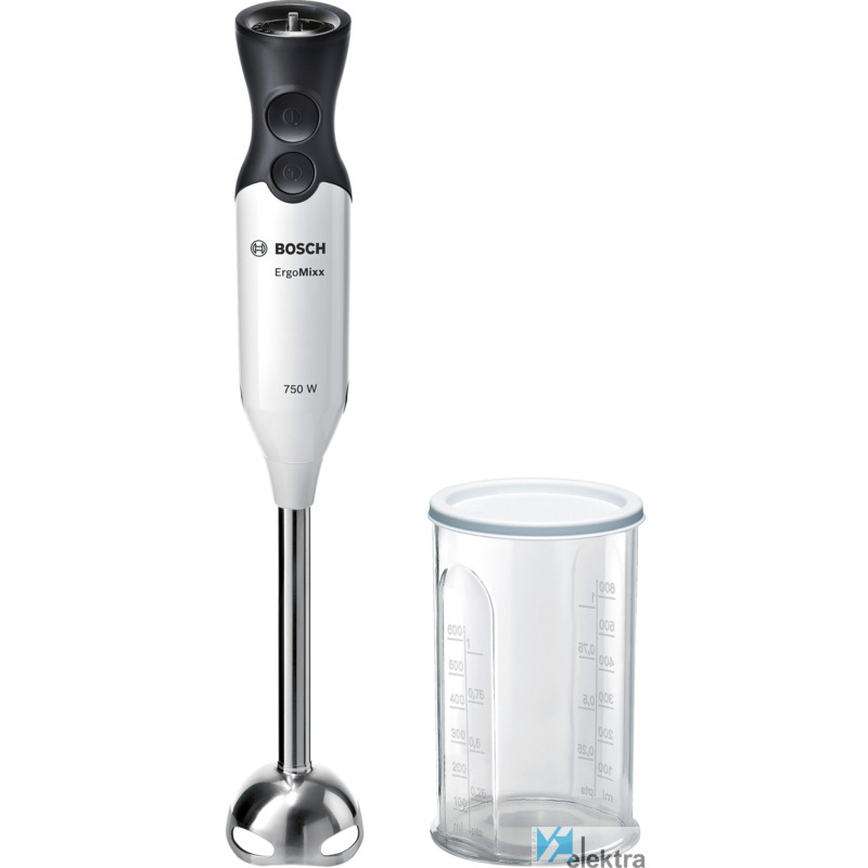 Bosch MSM67110W. Tipo: Batidora de inmersión, Color del producto: Negro, Acero inoxidable, Blanco. Material del vaso: Plástico, Material de la carcasa: Plástico, Material del eje: Acero inoxidable. Potencia: 750 W, Fuente de energía: Corriente alterna, Voltaje de entrada AC: 220 - 240 V. Ancho: 55 mm, Profundidad: 62 mm, Altura: 393 mm. Ancho del paquete: 110 mm, Profundidad del paquete: 110 mm, Altura del paquete: 430 mm