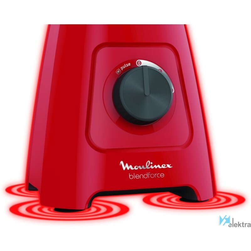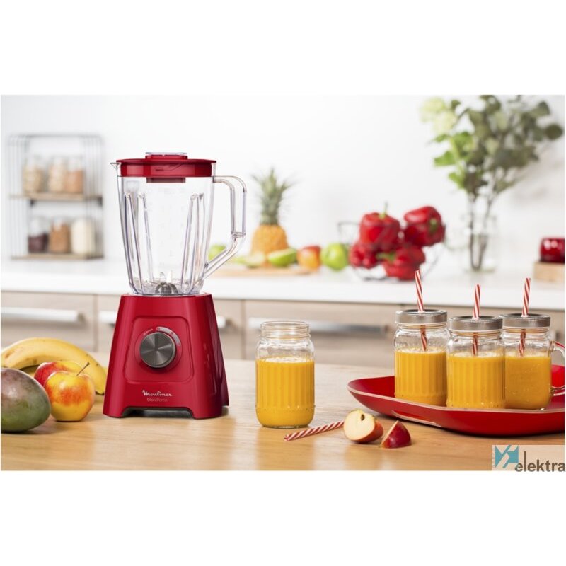 Moulinex LM420510. Tipo: Batidora de vaso, Color del producto: Rojo, Transparente, Unidades de la escala de medición: Tazas, Litros. Capacidad del tazón: 2 L, Tipo de control: Giratorio. Material del vaso: Plástico. Potencia: 550 W, Fuente de energía: Corriente alterna. Ancho: 180 mm, Profundidad: 185 mm, Altura: 370 mmRecipiente :