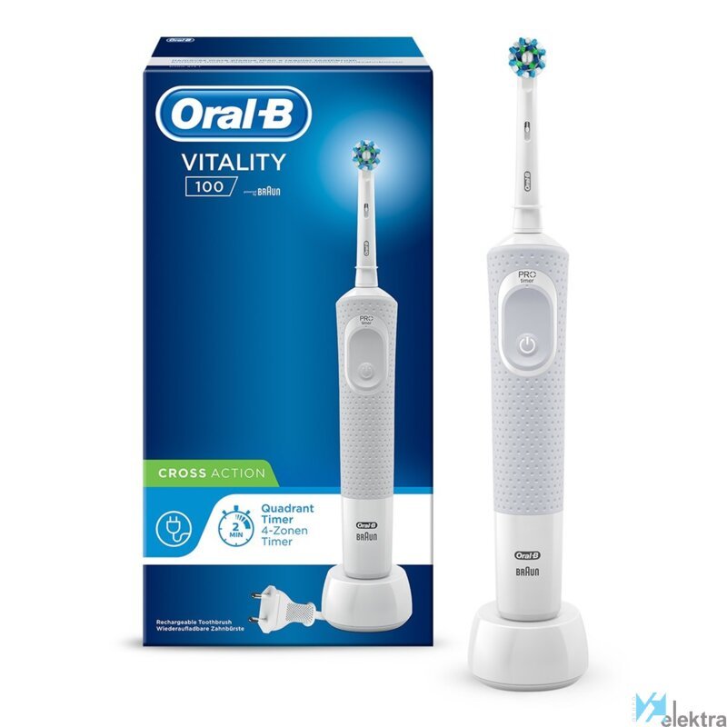 Oral-B Vitality 100 CrossAction. Utilizar con: Adulto, Tipo de cepillo de dientes: Cepillo dental oscilante, Color del producto: Blanco. Fuente de energía: Batería, Tipo de batería: Batería integrada. Número de empuñaduras incluidas: 1 pieza(s), Número de cabezales incluido: 1 pieza(s)