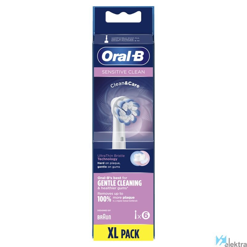 Oral-B Sensitive Clean 80339551. Número de cabezales incluido: 6 pieza(s), Color del producto: Blanco, País de origen: Hungría. Peso: 33,3 g. Ancho del paquete: 33 mm, Profundidad del paquete: 60 mm, Altura del paquete: 220 mm. Cantidad por paquete: 6 pieza(s), Ancho de la caja principal: 149 mm, Longitud de la caja: 217 mm. Cantidad de paquetes en el interior: 6 pieza(s)Recipiente :