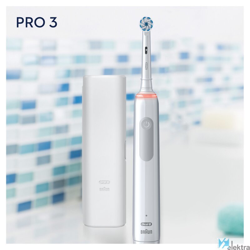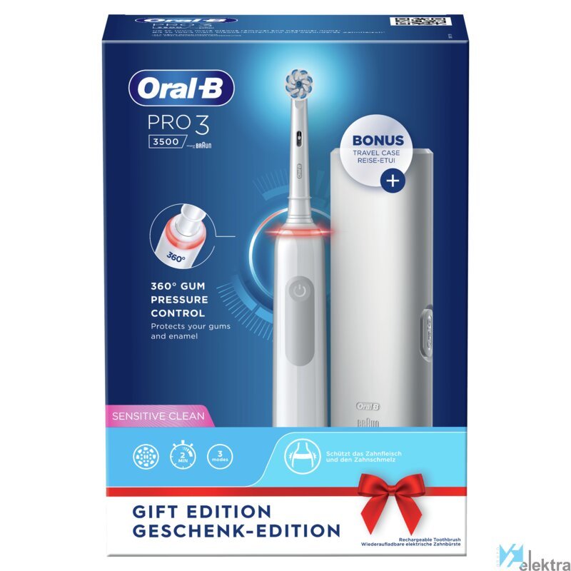 Oral-B Pro 3 3500. Utilizar con: Adulto, Modos del cepillo de dientes: Cuidados diarios, Sensible, Blanqueador, Color del producto: Blanco. Fuente de energía: Batería, Tipo de batería: Batería integrada, Tecnología de batería: Ión de litio. Peso: 335,65 g. Ancho del paquete: 94 mm, Profundidad del paquete: 169 mm, Altura del paquete: 240 mm. Número de empuñaduras incluidas: 1 pieza(s), Número de cabezales incluido: 1 pieza(s)