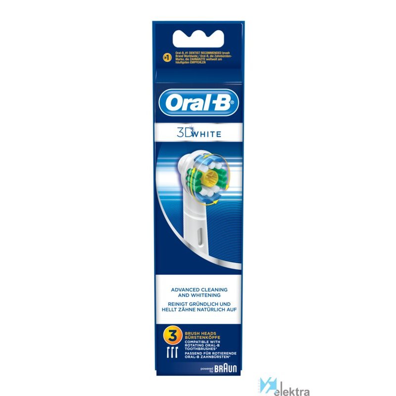 Oral-B EB 18-3. Número de cabezales incluido: 3 pieza(s), Color del producto: Azul, Blanco, Compatibilidad: - AdvancePower 900 - Plak Control ultra. Peso: 17 g. Ancho del paquete: 18 mm, Profundidad del paquete: 60 mm, Altura del paquete: 220 mm. Cantidad por paquete: 3 pieza(s), Ancho de la caja principal: 126 mm, Longitud de la caja: 149 mm. Cantidad de paquetes en el interior: 6 pieza(s)