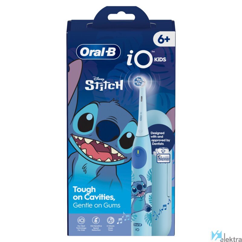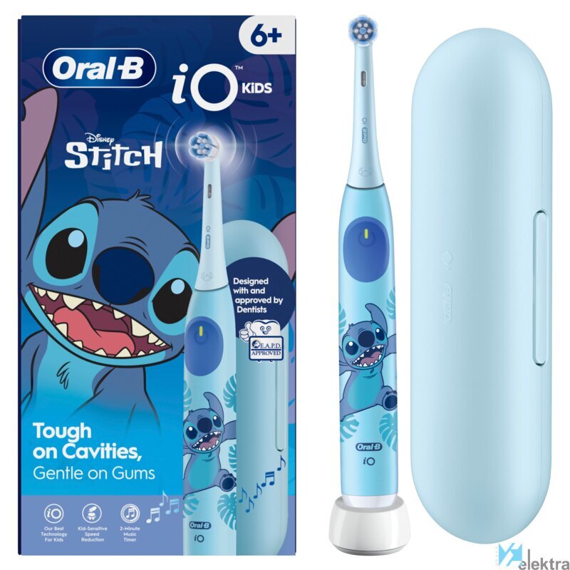 Oral-B iO Kids Disney Stitch with Travel Case. Utilizar con: Niño, Tipo de cepillo de dientes: Cepillo dental giratorio, Modos del cepillo de dientes: Cuidados diarios, Sensible, Super sensitive. Fuente de energía: Batería, Tipo de batería: Batería integrada. Tipo de embalaje: Caja. Número de empuñaduras incluidas: 1 pieza(s), Número de cabezales incluido: 1 pieza(s)