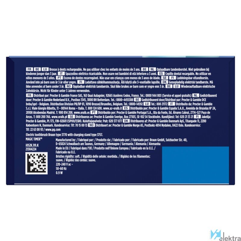 | Advertencias / Indicaciones | Inspecciona todo el producto/el cable eléctrico/los accesorios periódicamente para confirmar que no estén dañados. No utilices una unidad dañada o que no funcione correctamente. Si el producto/cable/accesorios están dañados, llévalos a un servicio técnico Oral-B. No alteres ni repares el producto. En caso de hacerlo, se podría producir un incendio, una descarga eléctrica o lesiones personales. Se desaconseja el uso del dispositivo por parte de niños menores de 3 años. Los niños y las personas con capacidad física, sensorial o psíquica reducida o que no tengan experiencia con el aparato podrán usar los cepillos de dientes bajo supervisión o con instrucciones para usar el aparato de forma segura y siempre que entiendan los posibles peligros. La limpieza y el mantenimiento del producto no debería llevarse a cabo por niños. Los niños no deben jugar con el aparato. Usa este producto únicamente para lo que ha sido diseñado, tal y como se muestra en el manual de instrucciones. No utilices ningún accesorio que no sea recomendado por el fabricante. Inspecciona todo el producto/el cable eléctrico/los accesorios periódicamente para confirmar que no estén dañados. No utilices una unidad dañada o que no funcione correctamente. Si el producto/cable/accesorios están dañados, llévalos a un servicio técnico Oral-B. No alteres ni repares el producto. En caso de hacerlo, se podría producir un incendio, una descarga eléctrica o lesiones personales. Se desaconseja el uso del dispositivo por parte de niños menores de 3 años. Los niños y las personas con capacidad física, sensorial o psíquica reducida o que no tengan experiencia con el aparato podrán usar los cepillos de dientes bajo supervisión o con instrucciones para usar el aparato de forma segura y siempre que entiendan los posibles peligros. La limpieza y el mantenimiento del producto no debería llevarse a cabo por niños. Los niños no deben jugar con el aparato. Usa este producto únicamente para lo que ha sido diseñado, tal y como se muestra en el manual de instrucciones. No utilices ningún accesorio que no sea recomendado por el fabricante. |