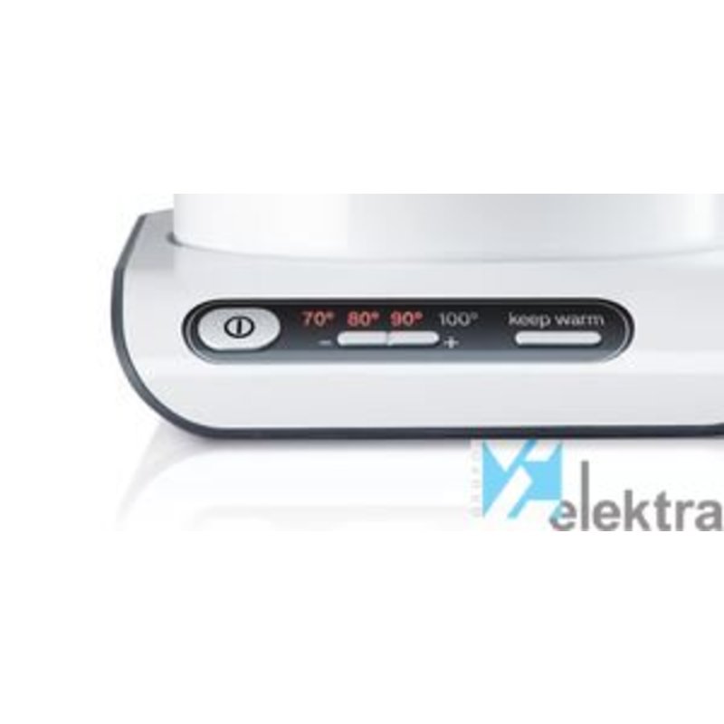 Bosch TWK8611P. Capacidad de reservorio de agua: 1,5 L. Potencia: 2400 W. Color del producto: Antracita, Acero inoxidable, Blanco, Material de la carcasa: Plástico, Acero inoxidable, Ajustes de termostato, Indicador de nivel de agua, Protección contra sobrecalentamiento. Sin cables. Función mantener caliente, FiltradoRecipiente :