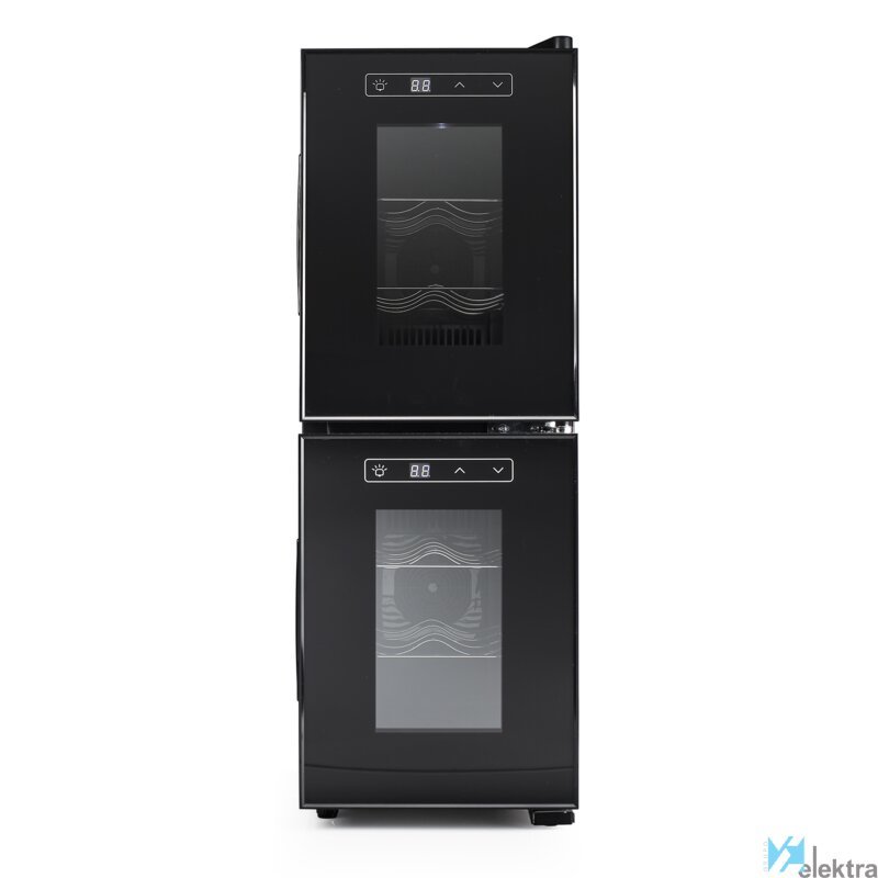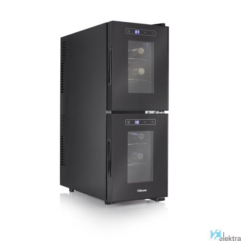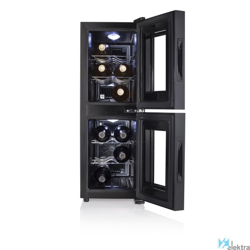 Tristar WR-7512 Vinoteca Dual Zone. Tipo de instalación: Independiente, Color de la carcasa: Negro, Color interior: Negro. Capacidad (botellas): 12 botella(s), Tipo de producto: Nevera de vino termoeléctrico, Rango de temperatura (zona 1): 7 - 18 °C. Tipo de control: Tocar, Tipo de visualizador: LED. Consumo de energía anual: 193 kWh, Clase de eficiencia energética (antigua): C. Ancho: 254 mm, ...Recipiente :