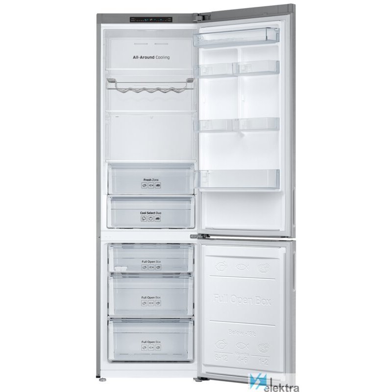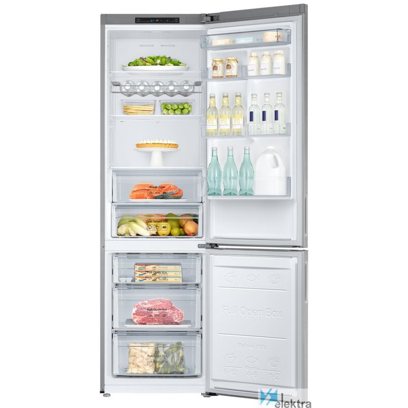 Samsung RB37J501MSA. Capacidad neta total: 376 L. Bisagra para puerta: Derecho. Clase climática: SN-T, Nivel de ruido: 38 dB. Frigorífico, capacidad neta: 268 L, Antiescarcha (nevera), Sistema multi-flujo de aire (nevera), Luz interior de la nevera. Congelador, capacidad neta: 108 L, Capacidad de congelación: 13 kg/24h, Antiescarcha (congelador). Compartimiento de zona fresca. Clase de eficiencia de energía: D, Consumo de energía anual: 206 kWh. Color del producto: Plata