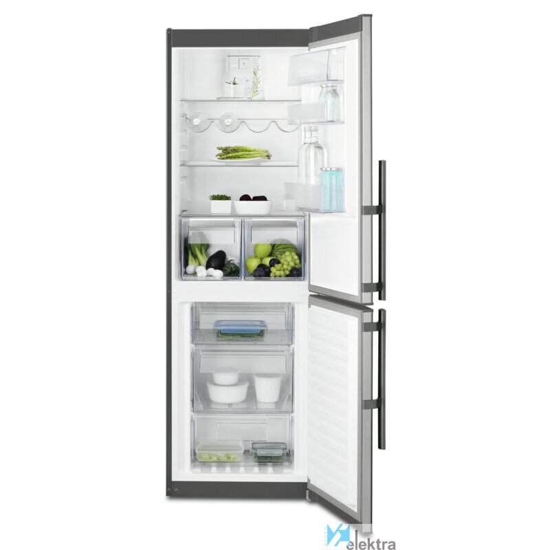 Electrolux EN3453MOX. Capacidad neta total: 314 L. Bisagra para puerta: Derecho. Clase climática: SN-T, Nivel de ruido: 43 dB. Frigorífico, capacidad neta: 223 L, Antiescarcha (nevera), Sistema multi-flujo de aire (nevera), Luz interior de la nevera, Frigorífico, número de compartimentos: 3. Congelador, capacidad neta: 91 L, Capacidad de congelación: 4 kg/24h, Antiescarcha (congelador). Compartimiento de zona fresca. Consumo de energía anual: 242 kWh. Color del producto: Acero inoxidable