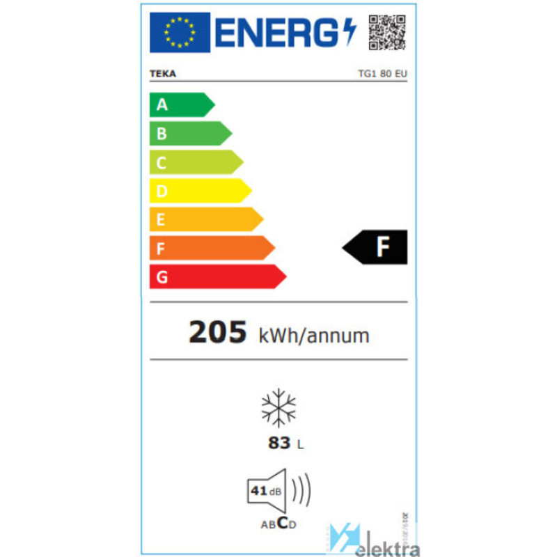 Teka TG1 80. Congelador, capacidad neta: 83 L, Clase climática: N-ST, Capacidad de congelación: 6 kg/24h, Tiempo de almacenamiento en caso de fallo de alimentación: 20 h, Nivel de ruido: 41 dB, Índice Star: 4*. Bisagra para puerta: Derecho. Clase de eficiencia de energía: F, Consumo de energía anual: 205 kWh. Color del producto: BlancoRecipiente :
