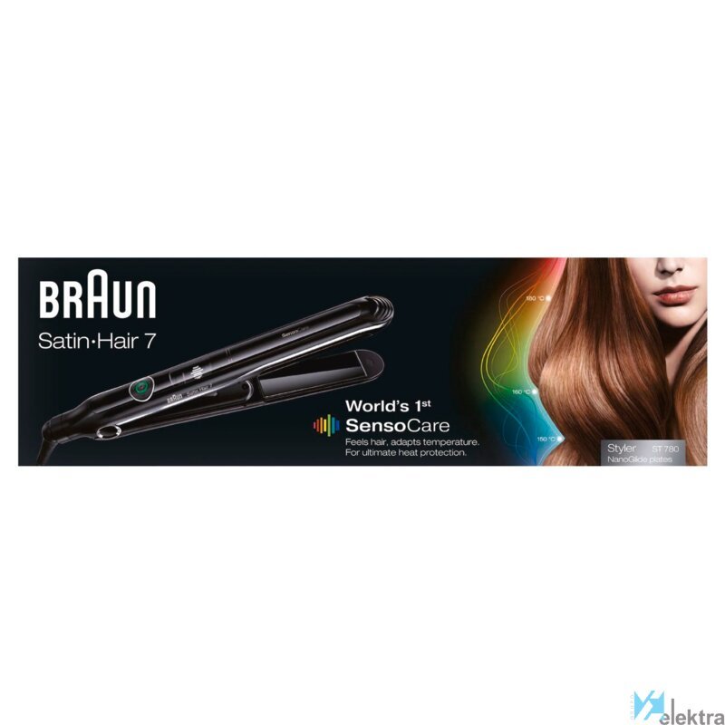 Braun Satin Hair 7 SensoCare ST780. Tipo: Plancha de pelo, Tecnología: Caliente, Temperatura (min): 120 °C. Color del producto: Negro, Material de la placa: Cerámico. Longitud del cable: 2 m. Fuente de energía: Corriente alterna, Voltaje de entrada AC: 100 - 240 V. Temperatura: 200 °CRecipiente :