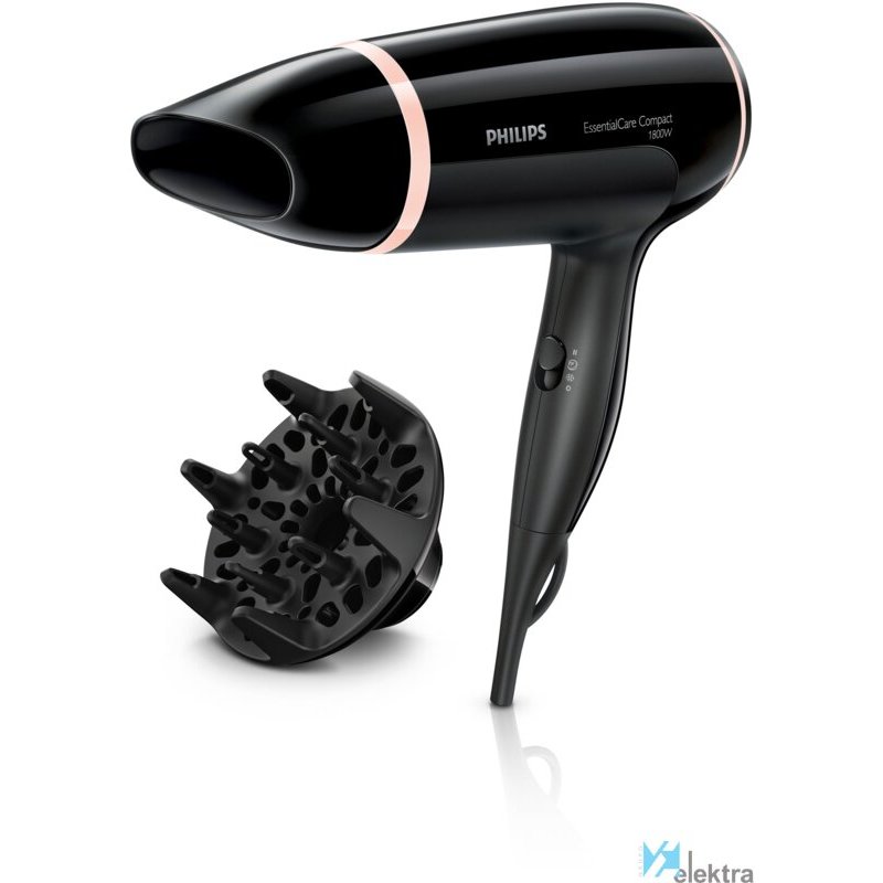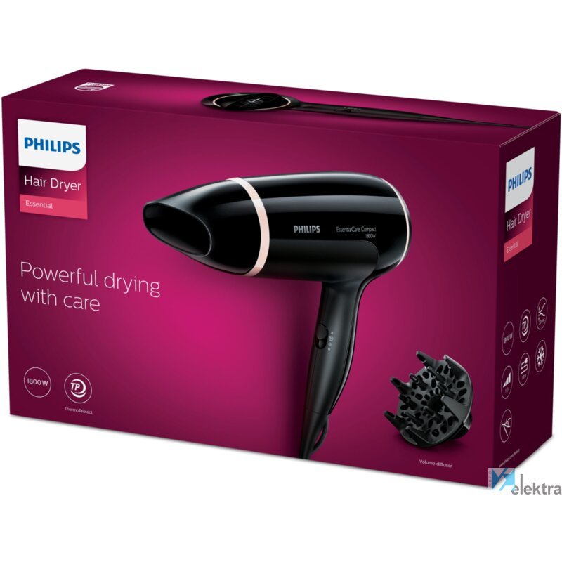 Philips Essential Secador BHD004/00. Tipo de motor: CC. Color del producto: Negro, Tipo de colgador: Con agujero en la empuñadura para colgar, Longitud del cable: 1,8 m. Potencia: 1800 W, Voltaje de entrada AC: 220-240 V, Frecuencia de entrada AC: 50 - 60 Hz. Ancho: 274 mm, Profundidad: 88 mm, Altura: 179 mm. Dimensiones de unidad de embalaje: 594 x 343 x 206 cm