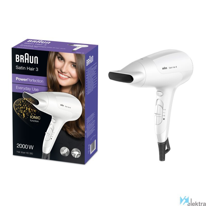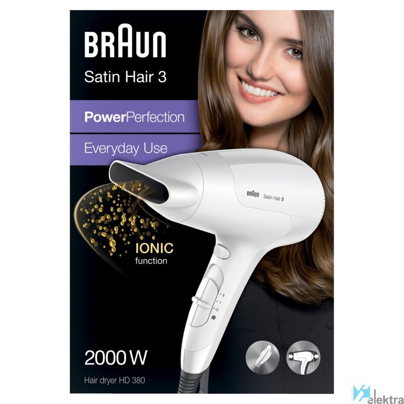 Braun Satin Hair HD 380. Color del producto: Blanco, Tipo de colgador: Con agujero en la empuñadura para colgar, Longitud del cable: 1,8 m. Potencia: 2000 W, Voltaje de entrada AC: 100 - 240 V. Peso: 590 g. Cantidad por paquete: 1 pieza(s), Ancho del paquete: 100 mm, Profundidad del paquete: 196 mm. Ancho de la caja principal: 318 mm, Longitud de la caja: 408 mm, Alto de la caja principal: 320 mm