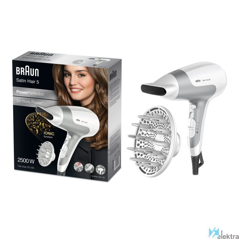Braun Satin Hair 5 HD 585. Color del producto: Blanco, Plata, Tipo de colgador: Con agujero en la empuñadura para colgar, Longitud del cable: 1,8 m. Potencia: 2500 W, Voltaje de entrada AC: 220 - 240 V. Peso: 710 g. Cantidad por paquete: 1 pieza(s), Ancho del paquete: 100 mm, Profundidad del paquete: 251 mm. Ancho de la caja principal: 214 mm, Longitud de la caja: 518 mm, Alto de la caja principal: 319 mm