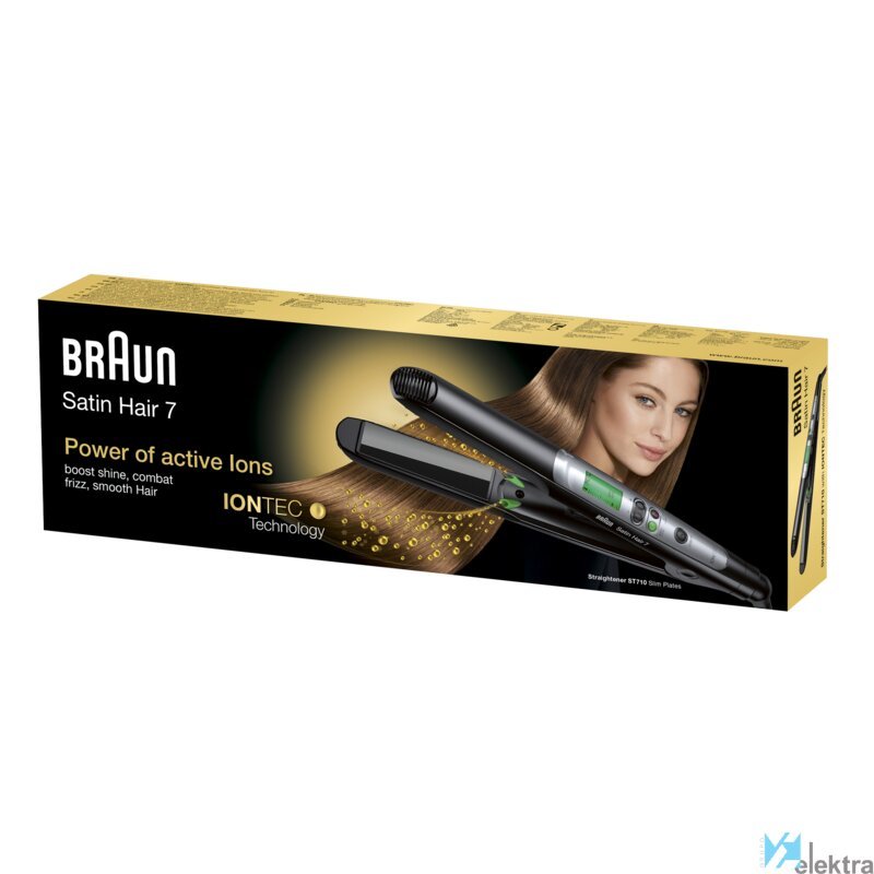 Braun Satin Hair 7 ST710. Tipo: Plancha de pelo, Tecnología: Caliente, Temperatura (min): 130 °C. Color del producto: Negro, Material de la placa: Cerámico, País de origen: China. Longitud del cable: 2 m, Tipo de visualizador: LED. Fuente de energía: Corriente alterna. Peso: 410 gRecipiente :