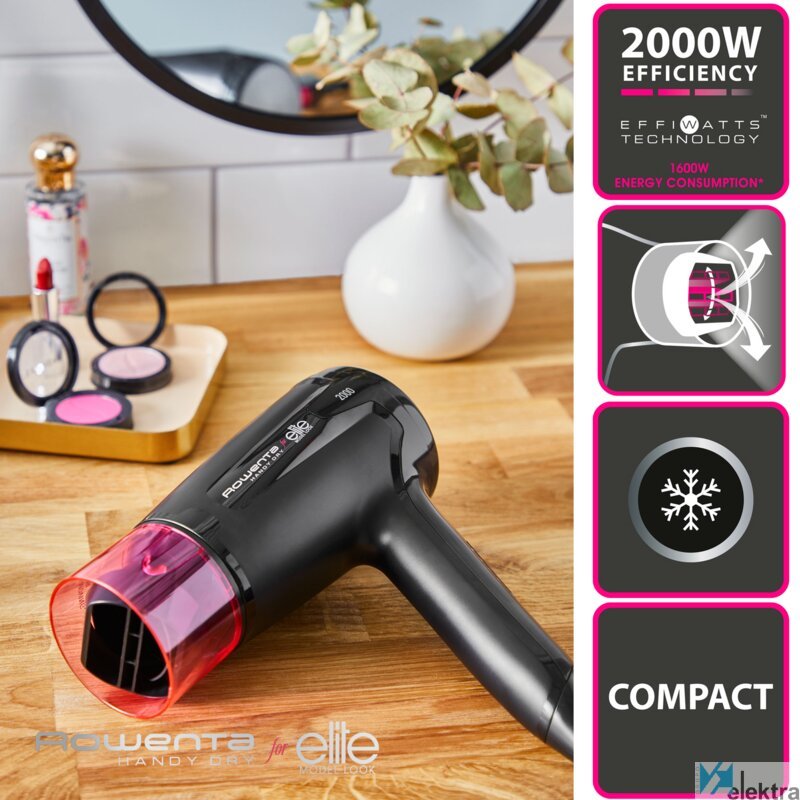 | Información suplementaria | Rowenta for Elite secador de pelo Handy Dry con boquilla autooscilante para dirigir el flujo de aire, generador de aire de movimiento automático, secado de alta eficiencia, ergonomía cómoda, pelo protegido, energéticamente eficiente, función de secado en frío; Producto reparable - 10 años: Diseñado para una fácil reparación, entrega rápida de bajo coste durante +10 años, 6500 centros de reparación en todo el mundo |