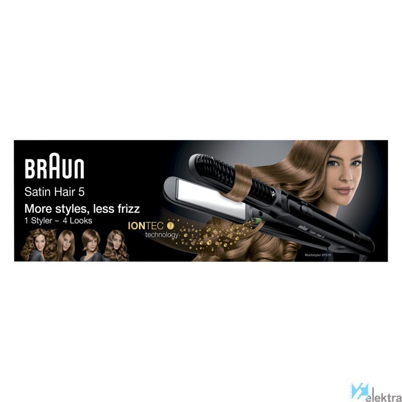 Braun Satin-Hair 5 ST 570. Tipo: Herramienta de peinado con múltiples accesorios, Tecnología: Caliente, Temperatura (min): 130 °C. Color del producto: Negro. Fuente de energía: Corriente alterna, Voltaje de entrada AC: 100 - 240 V, Frecuencia de entrada AC: 50 - 60 Hz. Peso: 400 g, Ancho de placa: 9 mm. Ancho del paquete: 52 mm, Profundidad del paquete: 354 mm, Altura del paquete: 111 mm