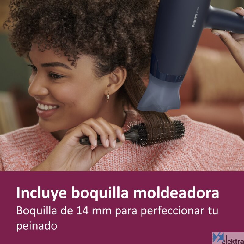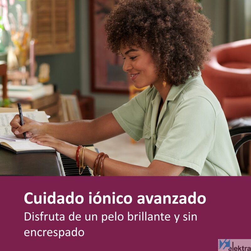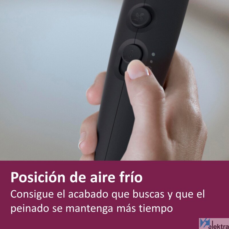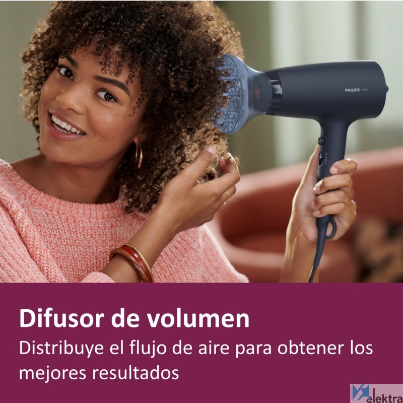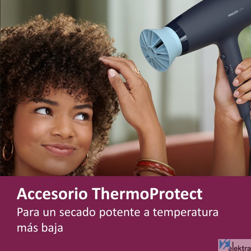 | Información suplementaria | El accesorio ThermoProtect de diseño exclusivo mezcla con gran potencia aire caliente y frío para el cuidado diario. Reduce la temperatura en 15 °C a la vez que seca el pelo rápidamente. El difusor de volumen distribuye el flujo de aire por el pelo, potenciando el volumen y reduciendo el encrespado durante el secado. Para obtener los mejores resultados, mantén el difusor cerca de la zona de la coronilla y de la raíz. Las patillas con textura fina del difusor aportarán volumen, maximizarán el grosor, las ondulaciones y darán forma a los rizos. |