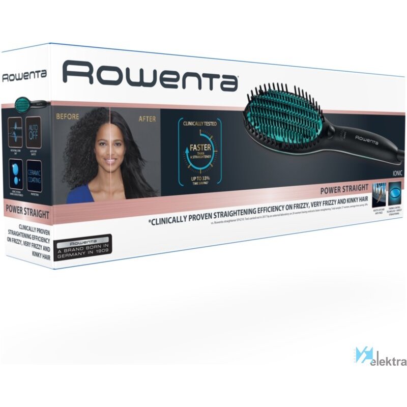 Rowenta Power Straight CF5820. Tipo: Cepillo alisador, Tecnología: Caliente, Forma del rizador de pelo: Cuerpo cilíndrico recto. Color del producto: Negro, Verde, País de origen: China. Longitud del cable: 1,8 m, Apagado automático después de: 60 min. Voltaje de entrada AC: 220-240 V. Ancho: 284 mm, Profundidad: 74 mm, Altura: 40 mmRecipiente :