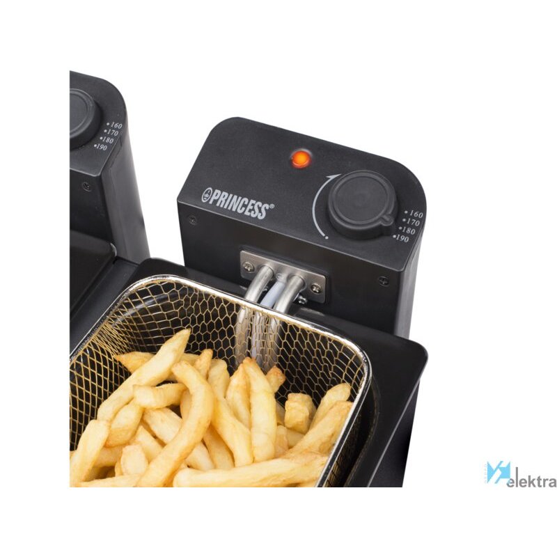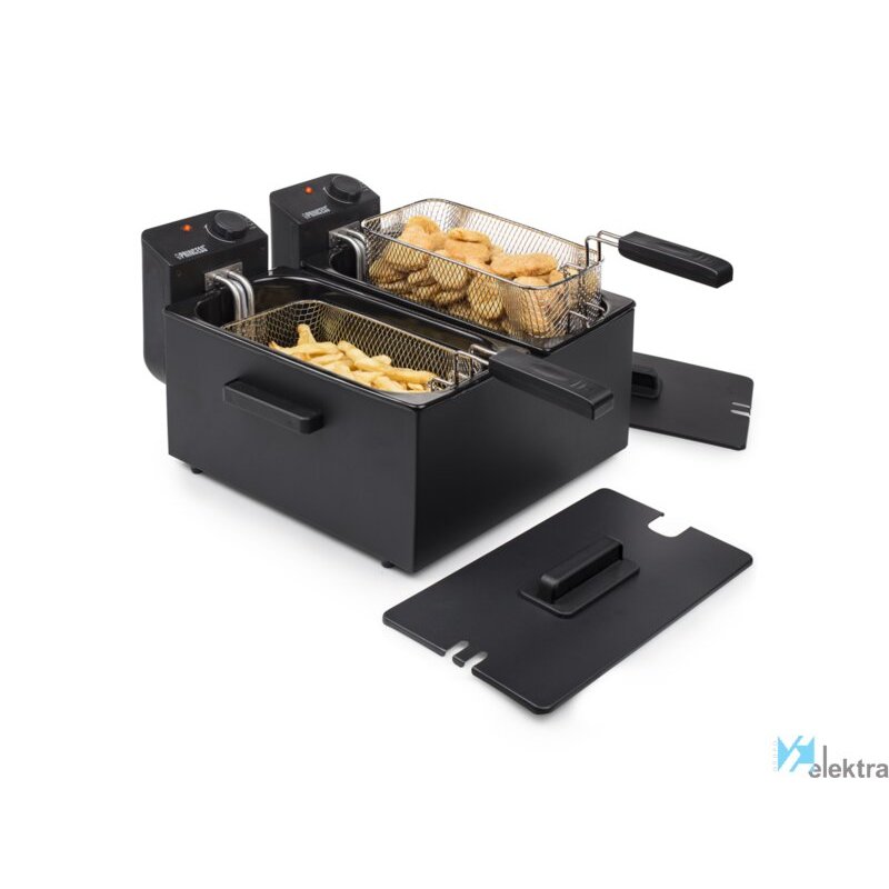 Princess 183028 Freidora negra doble. Tipo de producto: Freidora, Capacidad: 6 L, Capacidad de fritura: 1,8 kg. Tipo de construcción: Doble, Color del producto: Negro, Tipo de control: Giratorio. Potencia: 3600 W, Voltaje de entrada AC: 220-240 V. Ancho: 264 mm, Profundidad: 405 mm, Altura: 416 mm. Peso del paquete: 5,7 kgRecipiente :
