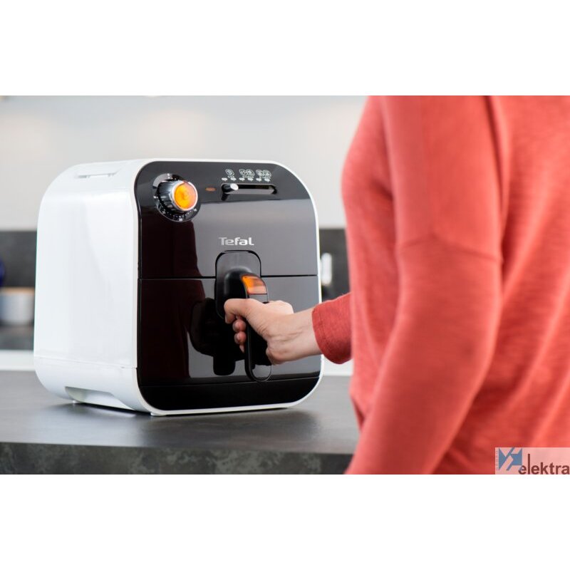 Tefal FX1000. Capacidad de fritura: 0,8 kg. Tipo de construcción: Sencillo, Color del producto: Negro, Blanco, Tipo de control: Giratorio, Barra de desplazamiento. Peso: 5,8 kg. Ancho del paquete: 342 mm, Profundidad del paquete: 452 mm, Altura del paquete: 367 mmRecipiente :