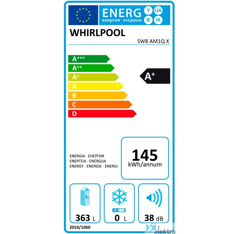 Whirlpool SW8 AM1Q X. Frigorífico, capacidad neta: 363 L, Sistema de descongelado, Clase climática: SN-T, Nivel de ruido: 38 dB. Frigorífico, número de compartimentos: 6, Número de compartimientos para verduras: 1, Bisagra para puerta: Derecho. Consumo de energía anual: 145 kWh. Peso: 62 kg. Color del producto: Acero inoxidable