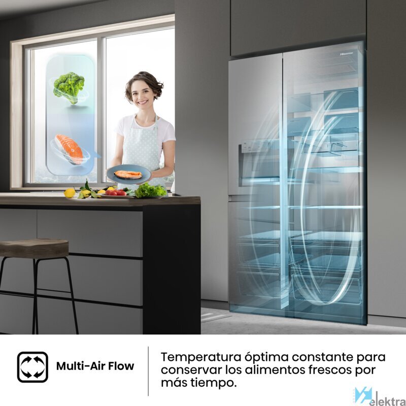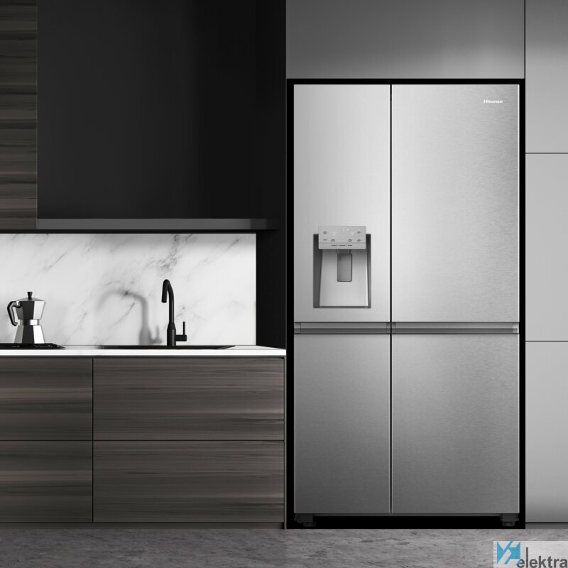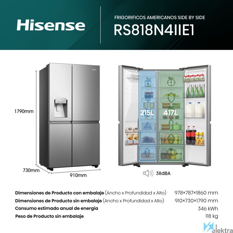 Hisense RS818N4IIE1. Tipo de instalación: Independiente, Diseño de producto: Puerta americana, Color del producto: Acero inoxidable. Capacidad neta total: 632 L, Clase climática: SN-T, Clase de emisión de ruido: C. Frigorífico, capacidad neta: 417 L, Tipo de lámpara: LED. Congelador, capacidad neta: 215 L, Posición congelada: Lateral, Capacidad de congelación: 11 kg/24h. Longitud del cable: 2 m