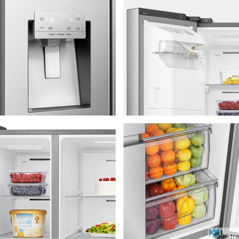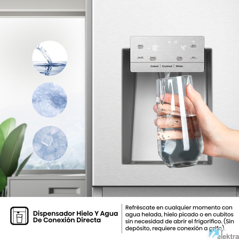 | Características principales | Sistema de control de temperatura digital; No Frost Total; Dispensador de agua y hielo con toma de agua; WiFi; Refrigeración rápida; Congelación rápida; Consumo anual: 346 kWh/annum; Clase de ruido: C; Nivel de ruido: 38; Clasificación energética: E; Capacidad de congelación: 11 kg/24h; Clase climática: N, T, ST, SN; Bloqueo infantil; Alarma de puerta abierta; Control de hielo; Modo Eco. |
