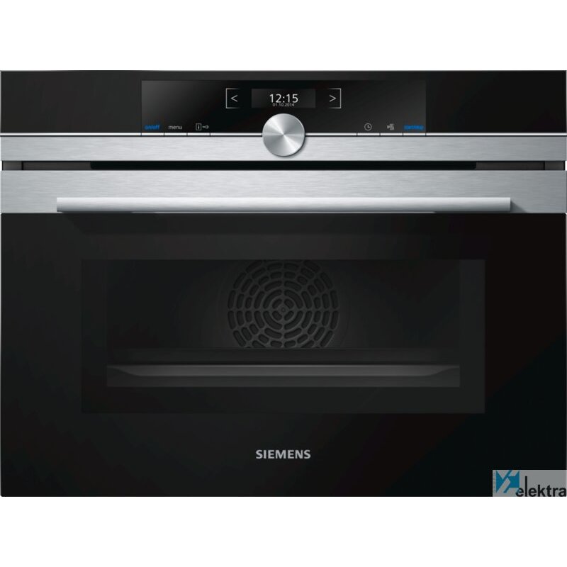 Siemens CM633GBS1. Tamaño del horno: Medio, Tipo de horno: Horno eléctrico, Total capacidad interior, horno (s): 45 L. Tipo de instalación: Integrado, Color del producto: Acero inoxidable, Tipo de control: Botones. Tipo de reloj: Electrónico. Carga conectada: 3650 W, Voltaje de entrada AC: 220-240 V, Frecuencia de entrada AC: 50 - 60 Hz. Tipo de lámpara: LEDRecipiente :
