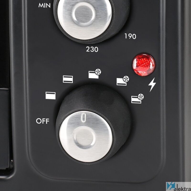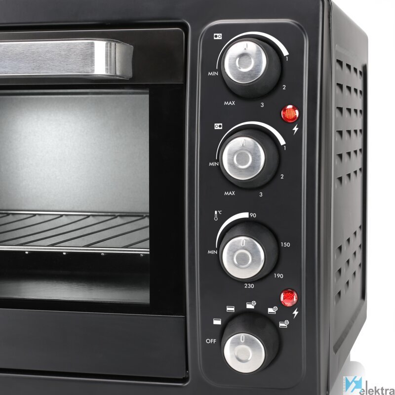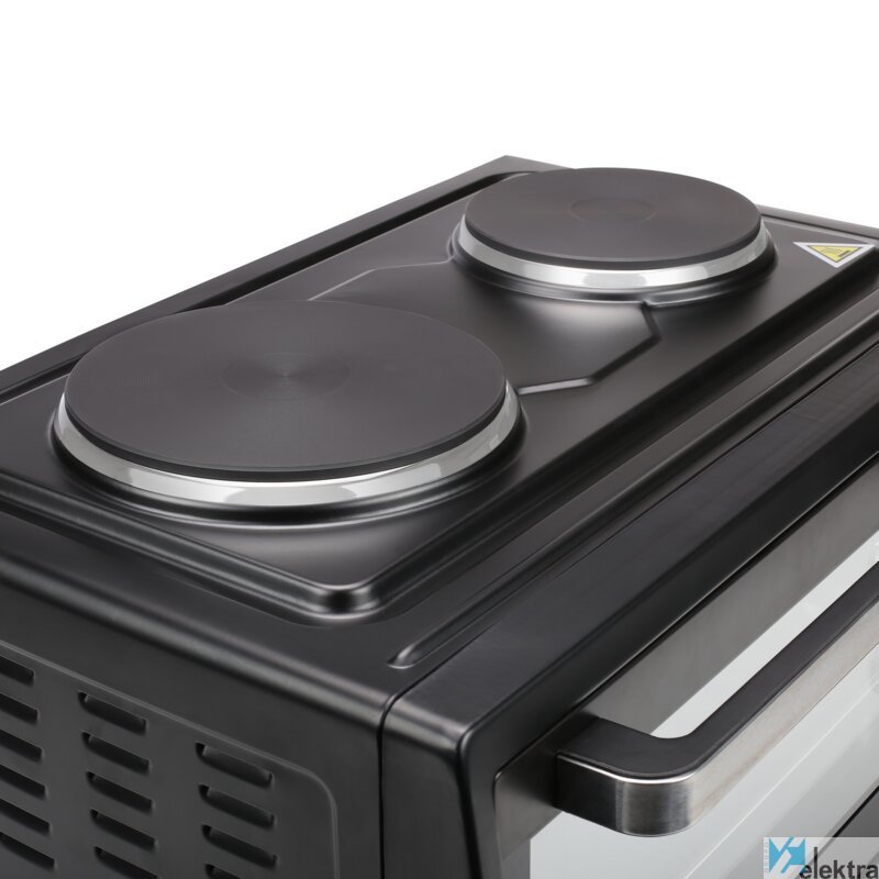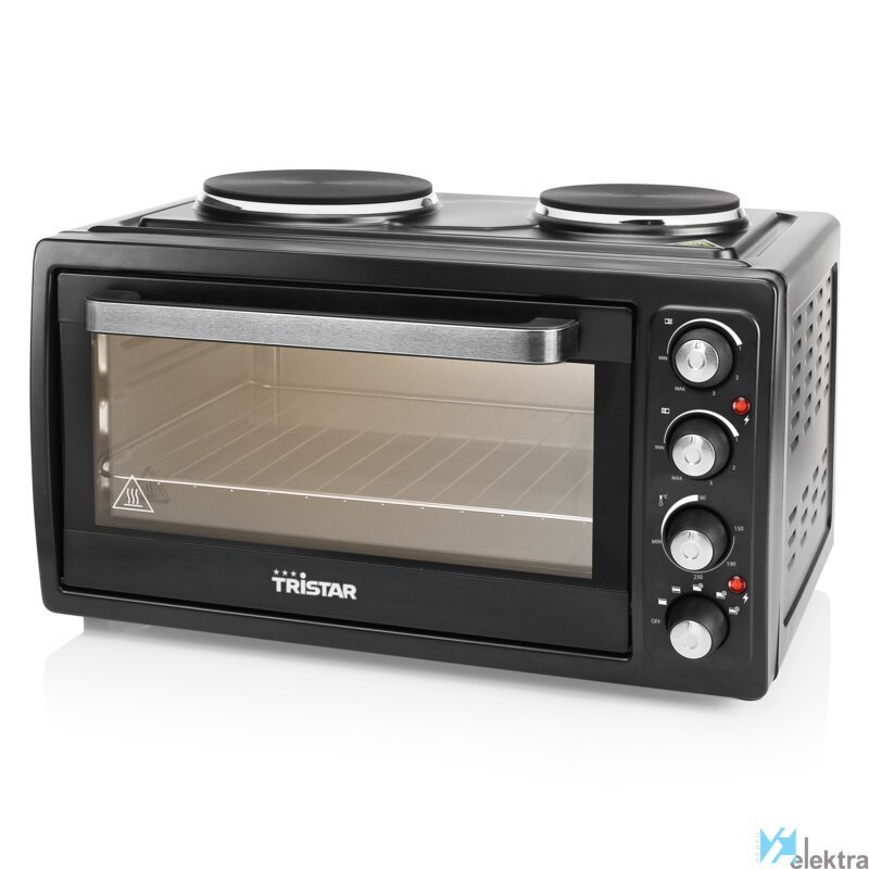 Tristar OV-1443 Horno de convección con 2 placas de cocción. Tipo de producto: Cocina portátil, Color del producto: Negro, Tipo de control: Giratorio. Tipo de quemador: Hornillo eléctrico / Placa eléctrica, Número de zonas de cocción: 2 zona(s), Tipo de superficie superior: esmalte de acero. Tamaño del horno: Pequeño, Fuente de alimentación del horno: Eléctrico, Capacidad neta del horno: 38 L. Consumo de energía (convencional): 3,1 kWh, Voltaje de entrada AC: 220 - 240 V, Frecuencia de entrada AC: 50 / 60 Hz. Peso: 11,8 kg