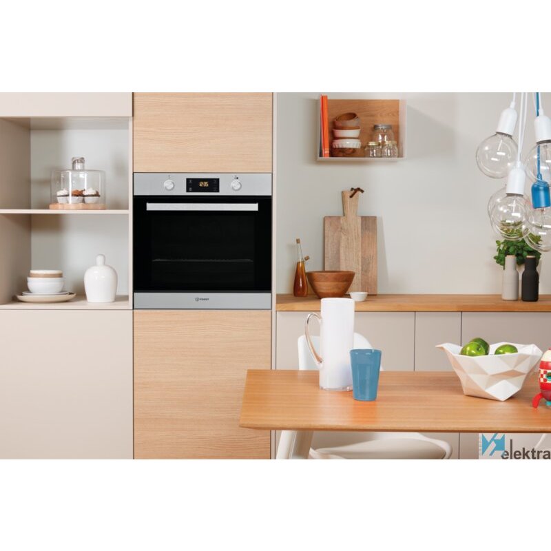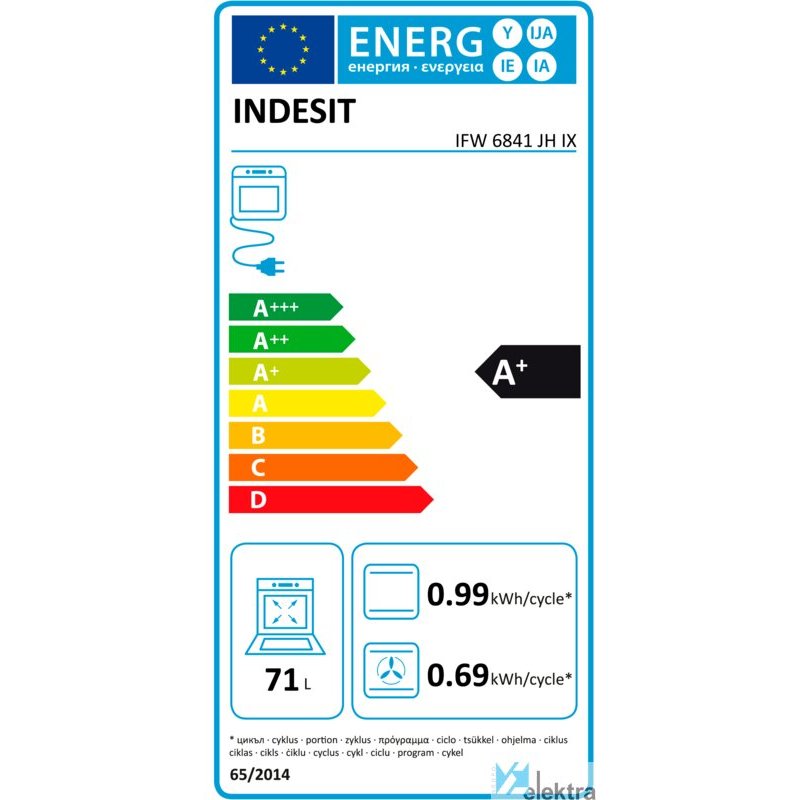 Indesit IFW 6841 JH IX. Tamaño del horno: Medio, Tipo de horno: Horno eléctrico, Total capacidad interior, horno (s): 71 L. Tipo de instalación: Integrado, Color del producto: Acero inoxidable, Tipo de control: Giratorio, Tocar. Tipo de reloj: Electrónico. Consumo de energía (convencional): 0,99 kWh, Consumo de energía (convección forzada): 0,69 kWh, Clase de eficiencia energética (antigua): A+. Ancho: 595 mm, Profundidad: 551 mm, Altura: 595 mm