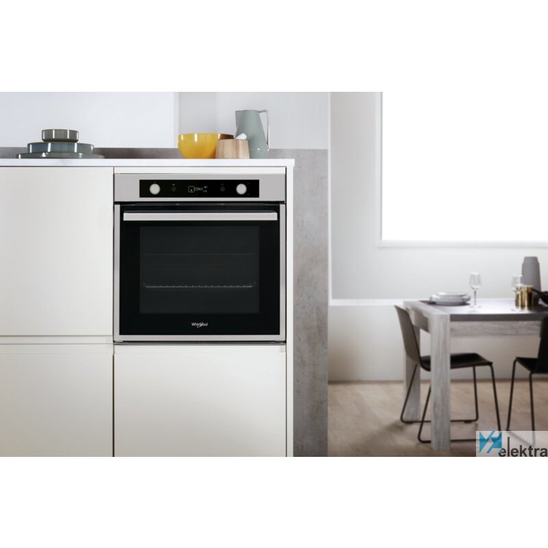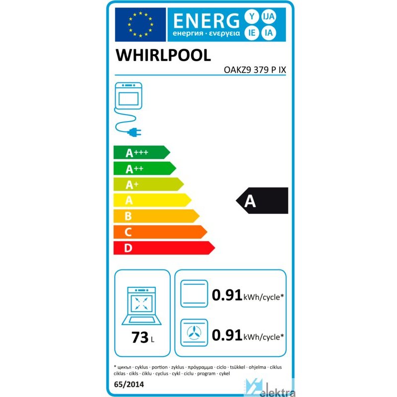 Whirlpool OAKZ9 379 P IX. Tamaño del horno: Medio, Tipo de horno: Horno eléctrico, Total capacidad interior, horno (s): 73 L. Tipo de instalación: Integrado, Color del producto: Acero inoxidable, Tipo de control: Giratorio, Tocar. Consumo de energía (convencional): 0,91 kWh, Consumo de energía (convección forzada): 0,82 kWh, Escala de eficiencia energética: A+++ a D. Ancho de compartimiento de ...Recipiente :
