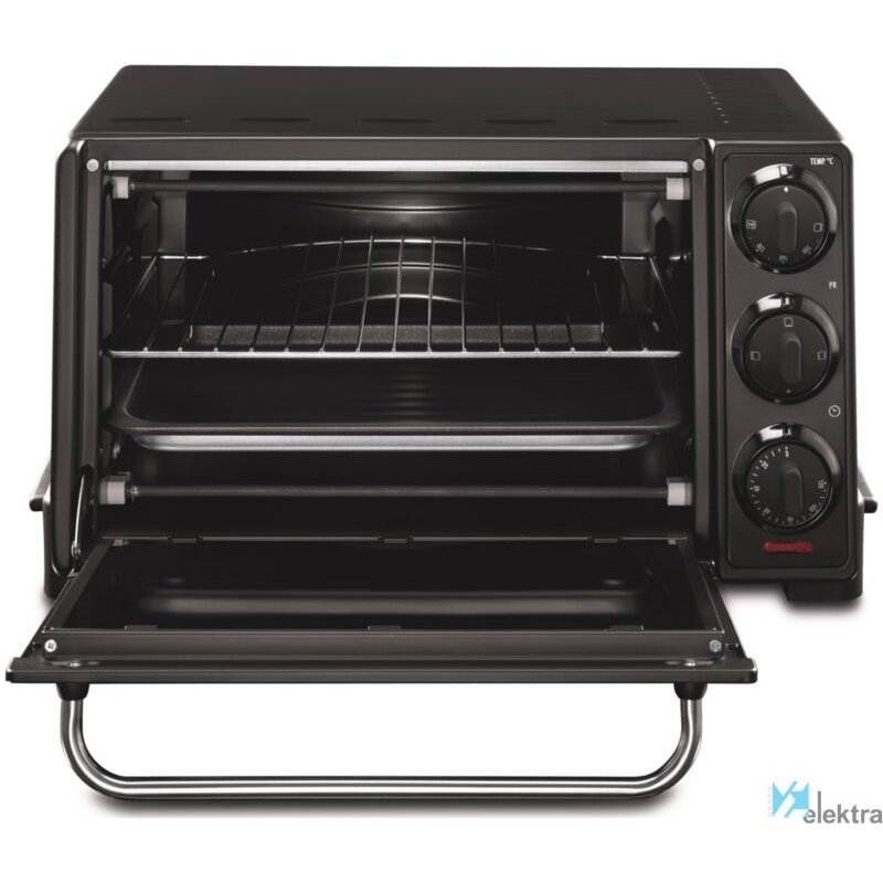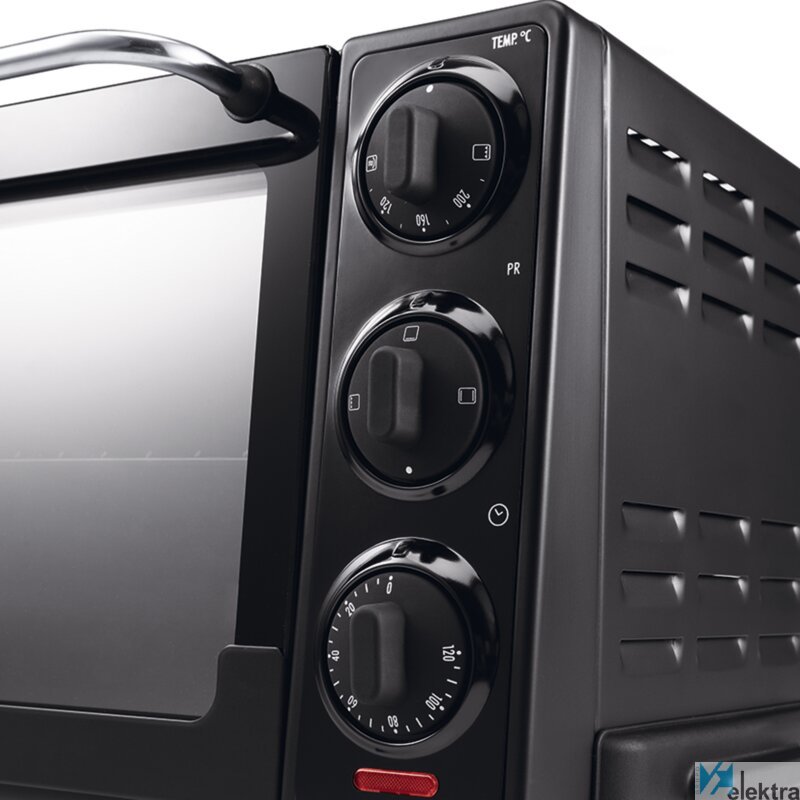 | Otras características | 4 funciones de cocción: cocina tradicional, cocina delicada; parrilla y mantener caliente; Capacidad interna de 20 litros para cacerola circular de Ø30cm; Revestimiento de cavidad antiadherente; Temporizador de 120 minutos con apagado automático y campana que avisa cuando estos se alcanzan; 6 - 220°C Termostato ajustable; Doble puerta de cristal; Luz indicadora de encendido apagado; Bandeja extraíble para recoger las migas y garantizar una fácil limpieza; Accesorios: 1 rejilla de alambre, 1 sartén rectangular de hornear, 1 bandeja para recoger las migas; Acabado en negro. |