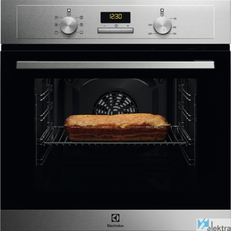 Electrolux Serie 300 EOH3H00BX. Tamaño del horno: Medio, Tipo de horno: Horno eléctrico, Total capacidad interior, horno (s): 65 L. Tipo de instalación: Integrado, Color del producto: Negro, Acero inoxidable, Tipo de control: Botones, Giratorio. Tipo de reloj: Electrónico. Consumo de energía (convencional): 0,89 kWh, Consumo de energía (convección forzada): 0,78 kWh, Escala de eficiencia energética: A+++ a D. Tipo de lámpara: Halógeno