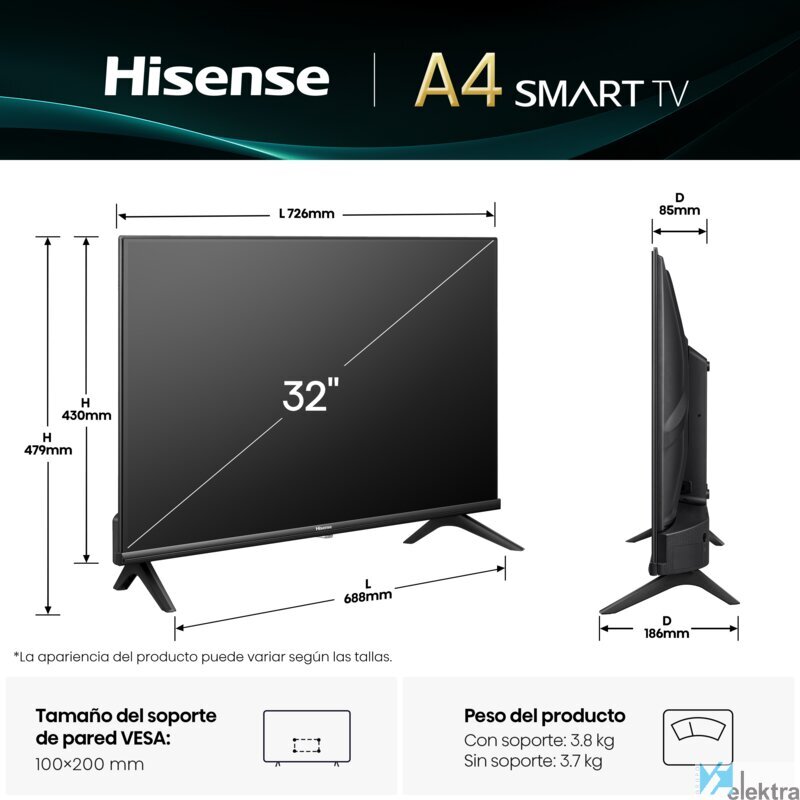 Hisense 32A4Q. Diagonal de la pantalla: 81,3 cm (32"), Resolución de la pantalla: 1366 x 768 Pixeles, Tipo HD: HD, Tecnología de visualización: DLED, Forma de la pantalla: Plana. Smart TV. Tiempo de respuesta: 8,5 ms, Razón de contraste (típica): 3000:1, Relación de aspecto nativa: 16:9. Formato de señal digital: DVB-C, DVB-S, DVB-S2, DVB-T, DVB-T2. Wifi, Ethernet. Color del producto: Negro
