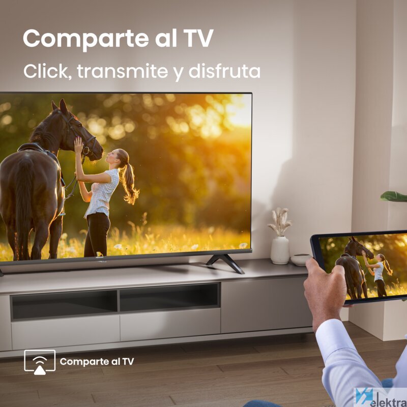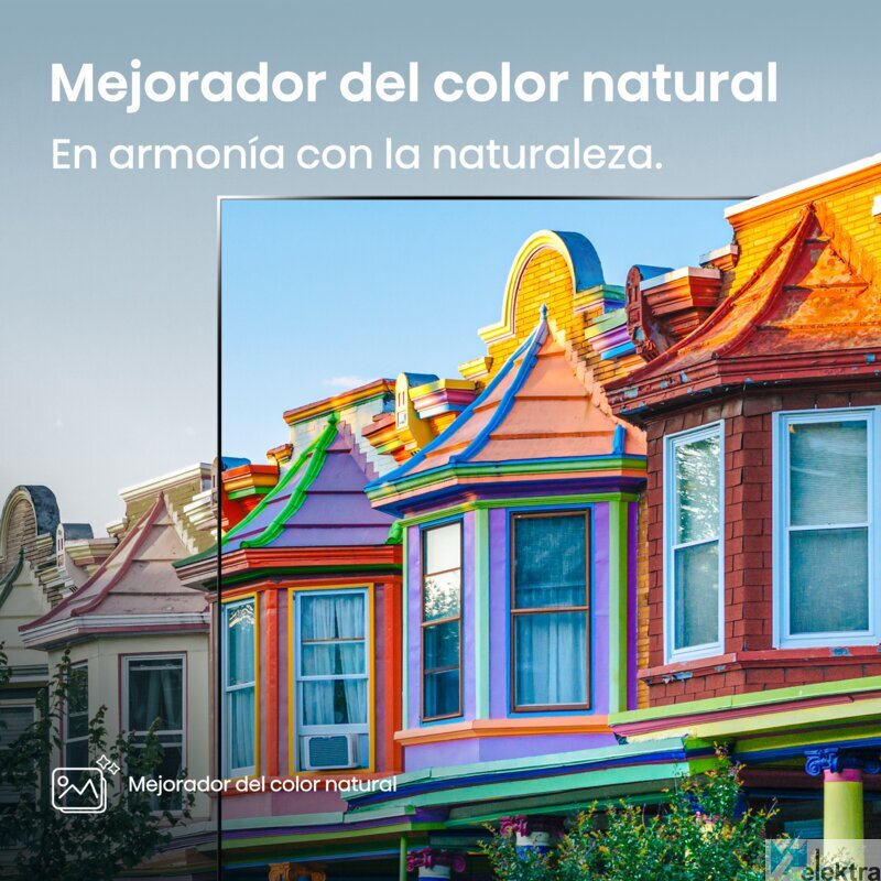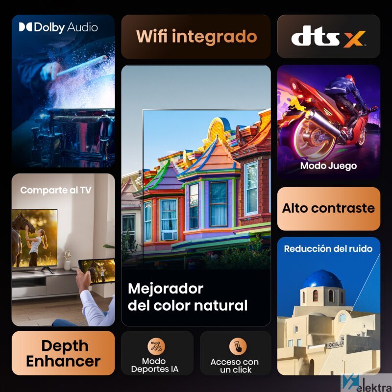 | Otras características | Resolución HD; Sistema operativo inteligente (VIDAA); Potenciador de color natural; DTS Virtual:X y Dolby Audio; Modo deportivo con IA; Compartir en TV; Modo juego; Alto contraste; Potenciador de profundidad; Reducción de ruido; Conectividad. |