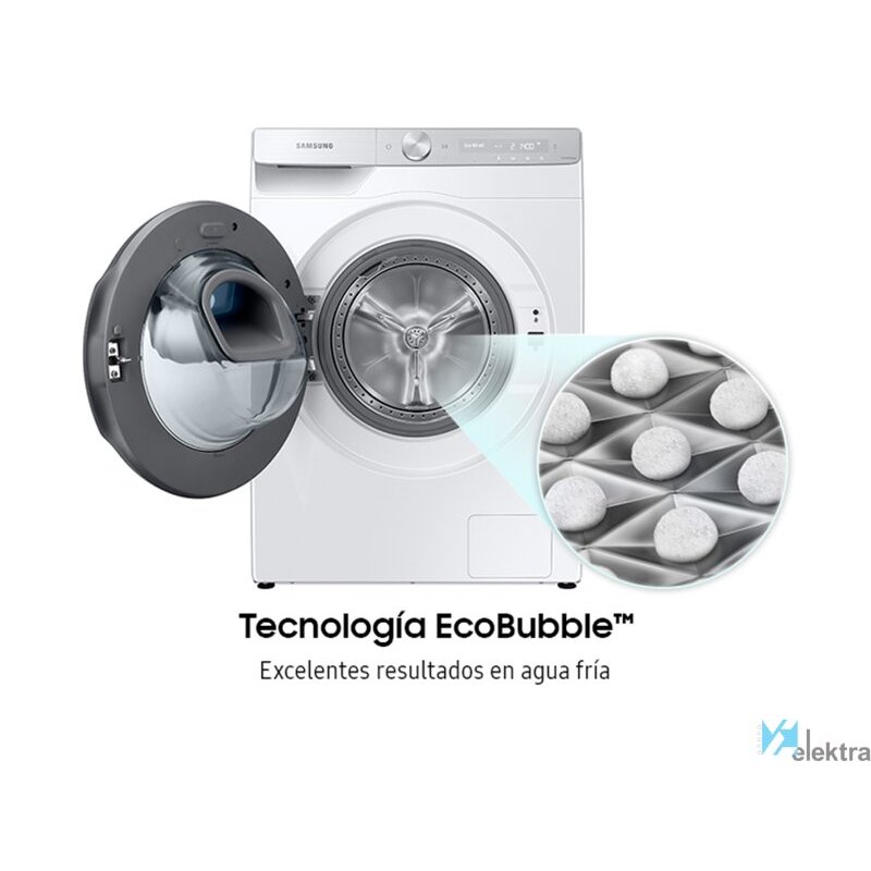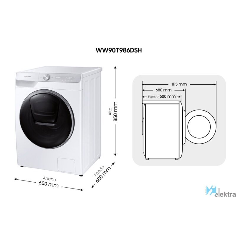 Samsung WW90T986DSH. Tipo de carga: Carga frontal. Capacidad nominal: 9 kg, Clase de secado por giro: A, Nivel de ruido (spin): 72 dB, Máxima velocidad de centrifugado: 1600 RPM. Color del producto: Blanco. Ancho: 600 mm, Profundidad: 600 mm, Altura: 850 mm. Clase de eficiencia de energía: A