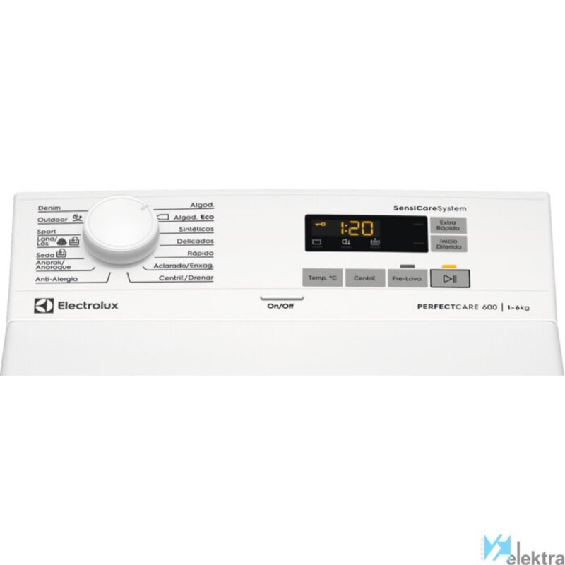 Electrolux EW6T5621AI. Tipo de carga: Carga superior. Capacidad nominal: 6 kg, Clase de secado por giro: B, Nivel de ruido (spin): 78 dB, Nivel de ruido (lavado): 57 dB, Máxima velocidad de centrifugado: 1200 RPM. Color del producto: Blanco. Ancho: 400 mm, Profundidad: 600 mm, Altura: 890 mm. Clase de eficiencia de energía: F