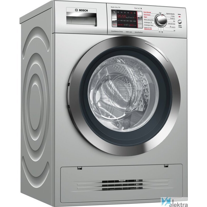 Bosch Serie 6 WVH2849XEP. Tipo de carga: Carga frontal, Tipo de instalación: Independiente, Color del producto: Acero inoxidable. Capacidad de nominal (lavado y secado): 4 kg, Máxima velocidad de centrifugado: 1400 RPM, Capacidad nominal (lavado): 7 kg. Longitud del cable: 2,1 m. consumo de agua de lavado: 50 L, consumo de agua de lavado y secado: 57 L, Consumo de energía por ciclo de lavado: 0,66 kWh. Profundidad: 590 mm, Ancho: 598 mm, Altura: 848 mm