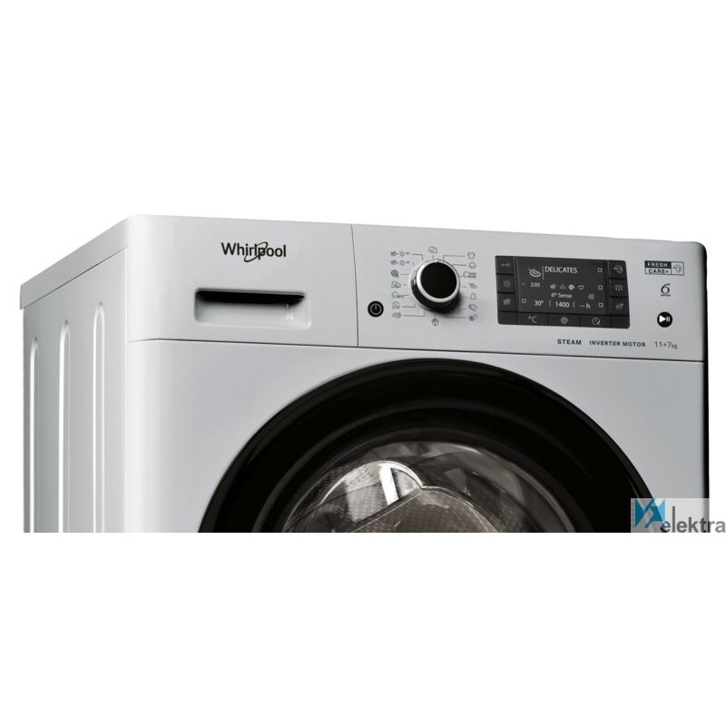 Whirlpool FWDD 1171582 SBV EU N. Tipo de carga: Carga frontal, Tipo de instalación: Independiente, Color del producto: Plata. Capacidad de nominal (lavado y secado): 7 kg, Máxima velocidad de centrifugado: 1600 RPM, Clase de secado por giro: A. Clase de eficiencia energética (lavado): D, Clase de eficiencia energética (lavado y secado): E, consumo de agua de lavado: 52 L. Profundidad: 605 mm, Ancho: 595 mm, Altura: 850 mm