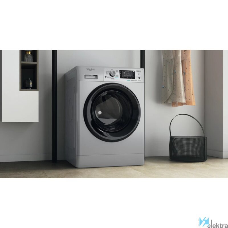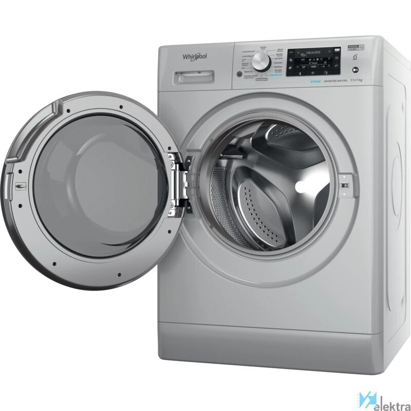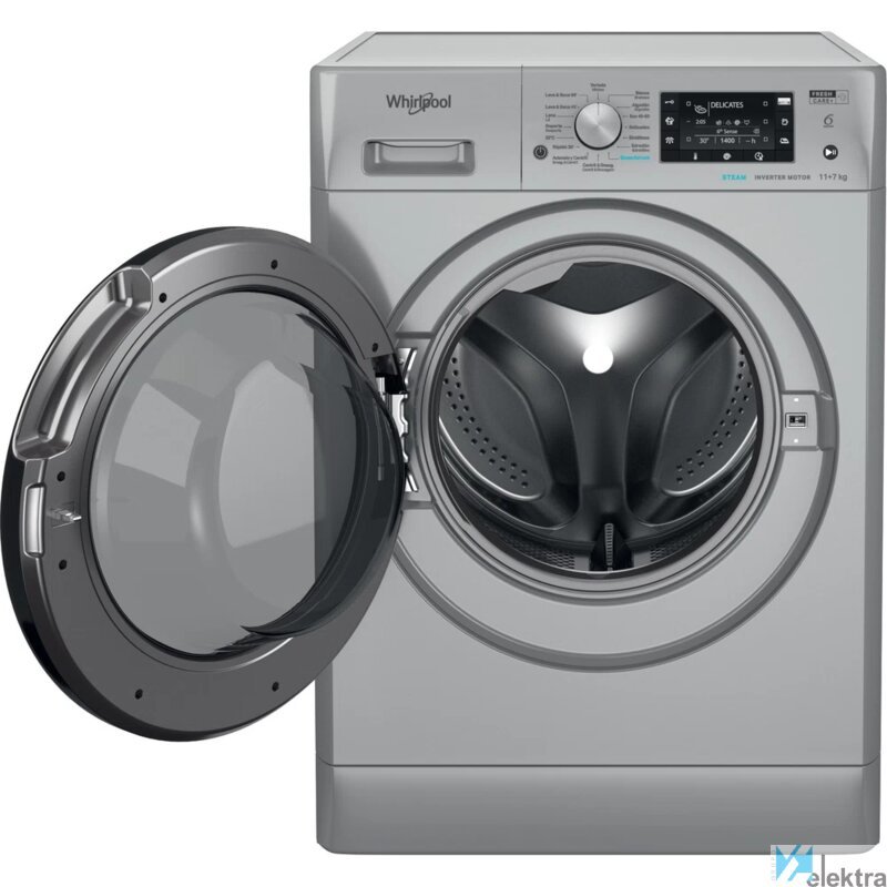 Whirlpool FFWDD 1174269 SBV. Tipo de carga: Carga frontal, Tipo de instalación: Independiente, Color del producto: Plata. Capacidad de nominal (lavado y secado): 7 kg, Máxima velocidad de centrifugado: 1400 RPM, Clase de secado por giro: B. Clase de eficiencia energética (lavado): A, Clase de eficiencia energética (lavado y secado): D, consumo de agua de lavado: 54 L. Profundidad: 605 mm, Ancho: 595 mm, Altura: 850 mm